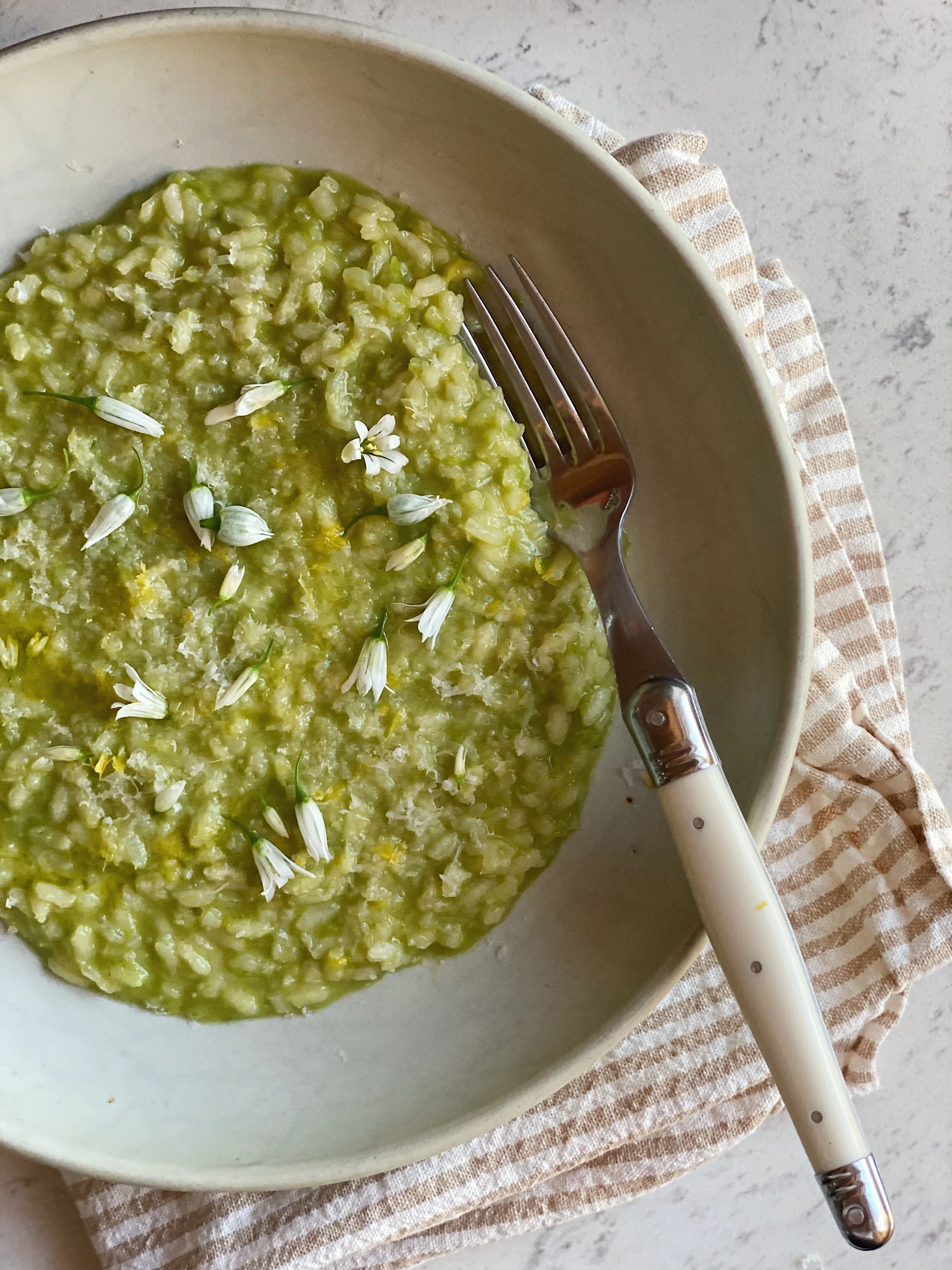 Risotto is one of my absolute favorite foods and this version is spring in a bowl. It’s bright, fresh and bursting with some of my favorite flavors. If you can’t find green garlic you can, of course, use regular garlic! Regular lemons work in lieu of meyer lemons as well.